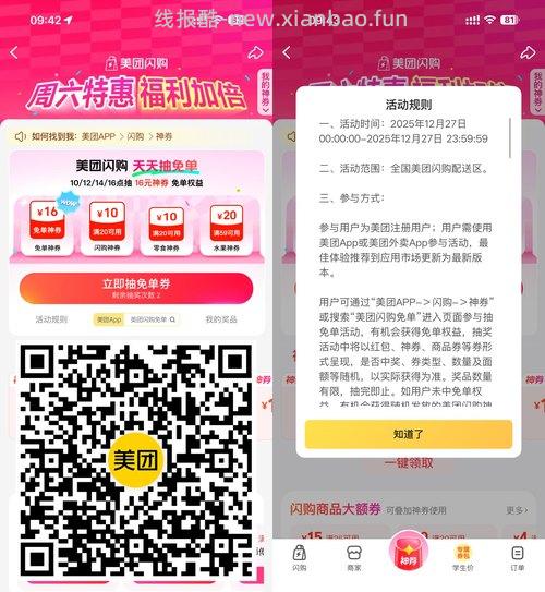 【美团抽30万份30亓闪购免单】美团APP扫码->今天11/12/14/16点会放水,抽啤酒/水果/闪购免单神券