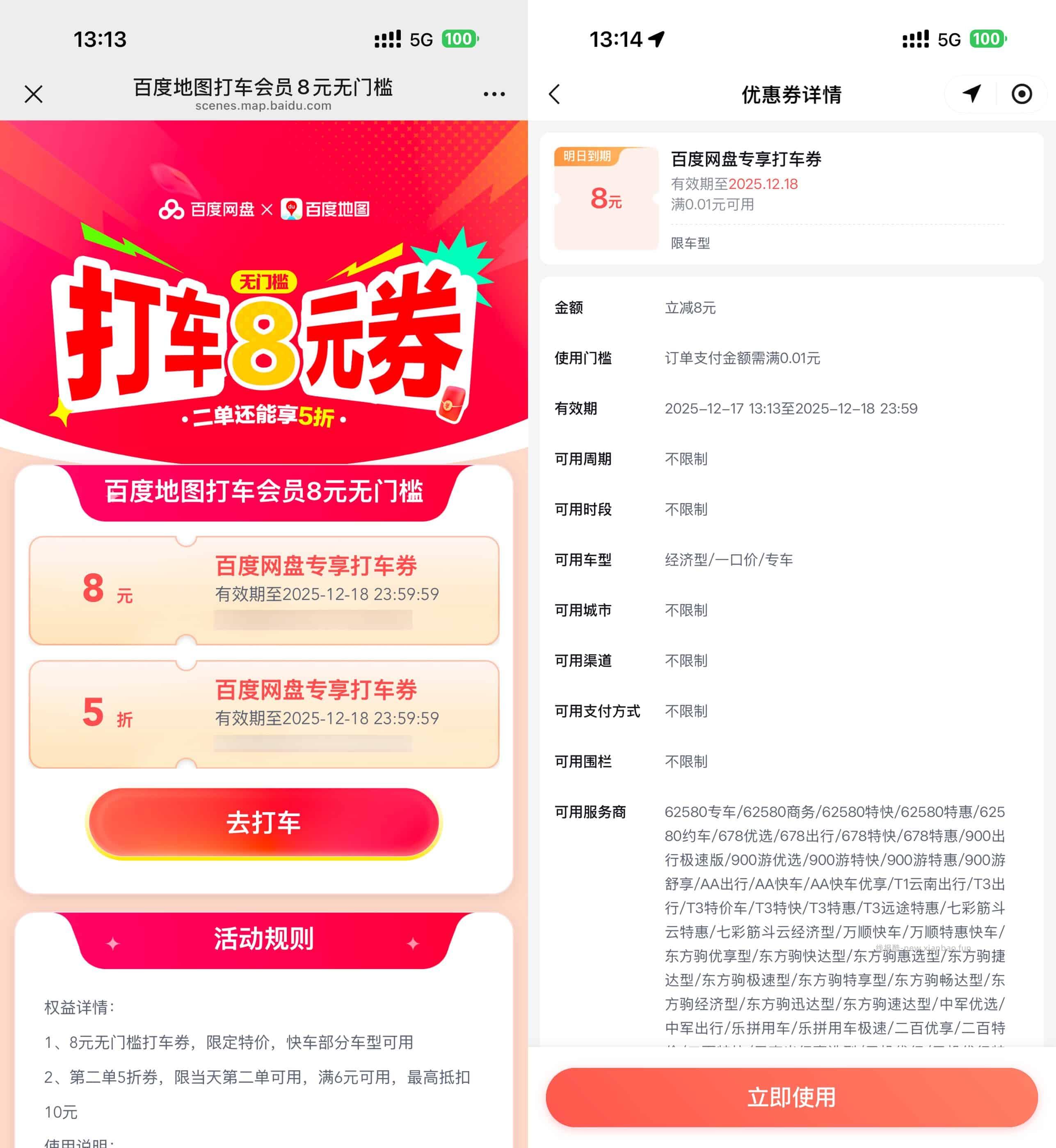 【百度打车领8亓无门槛打车券】