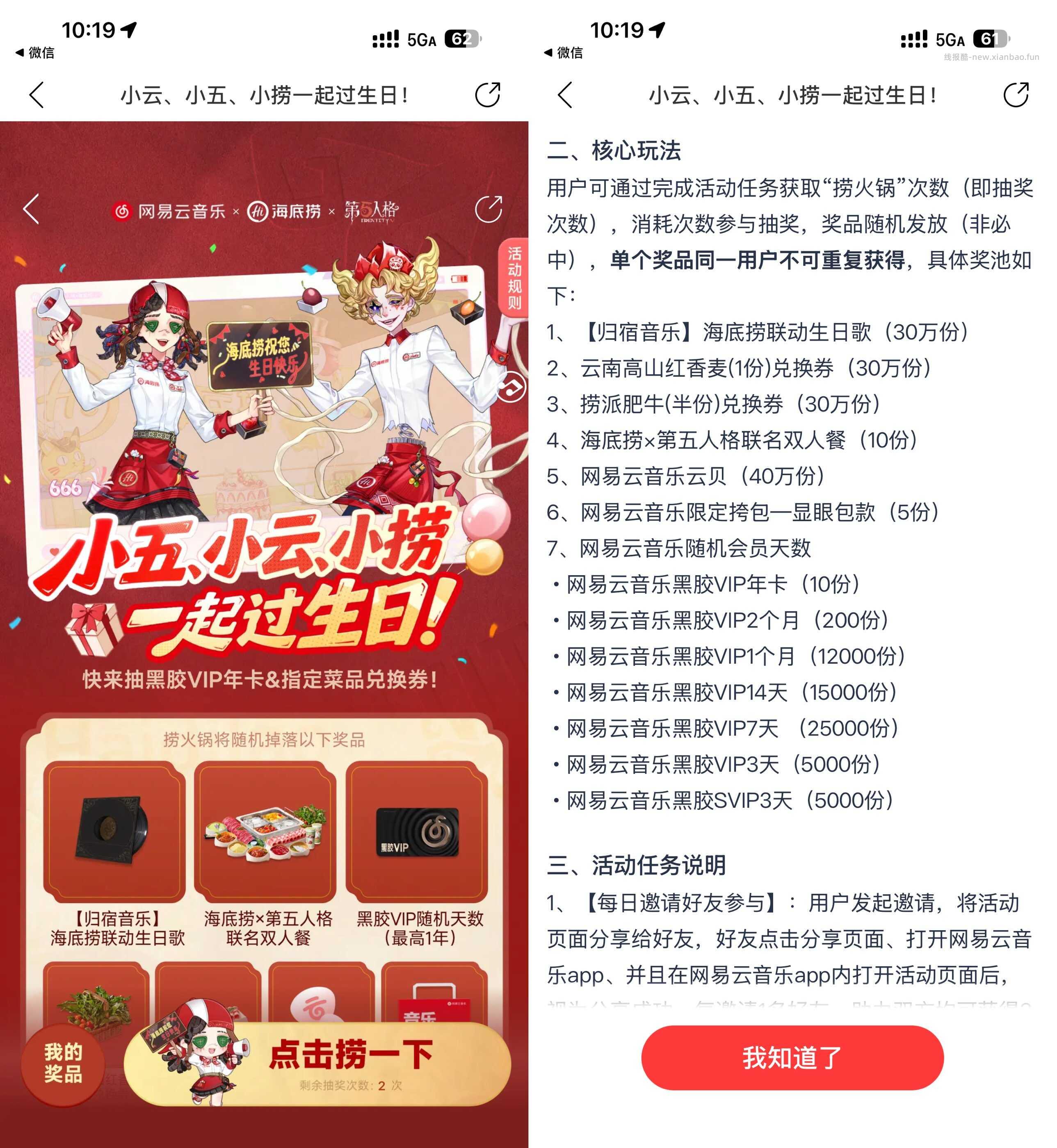 跳转到网易云音乐APP->抽海底捞菜品兑换券,或3~365天黑胶会员
