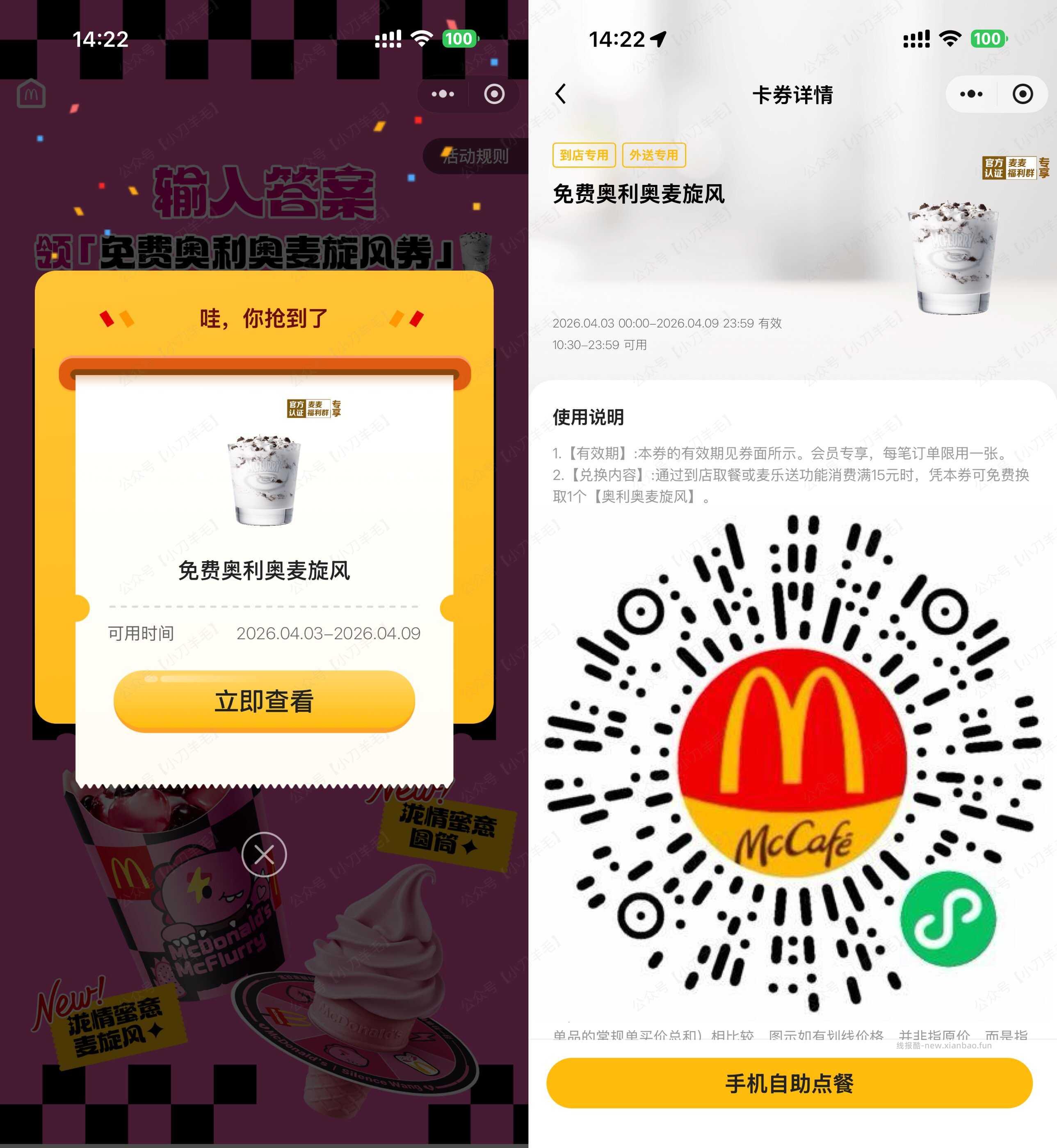 微信打开活动->输入口令“粉旋风”领免费麦旋风,需任意消费15亓随单使用